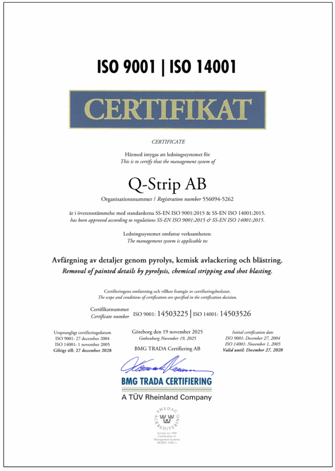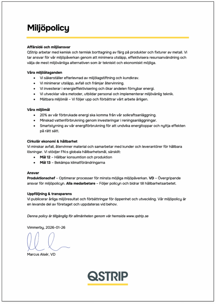 Vi på QStrip tar vårt ansvar för miljön genom extremt hård kontroll på utsläpp till luft. Tack vare helt slutna och återvinningsbara system har vi inga utsläpp av processvatten. Vi tar vara på spillvärme som bidrar med uppvärmningen av våra lokaler.