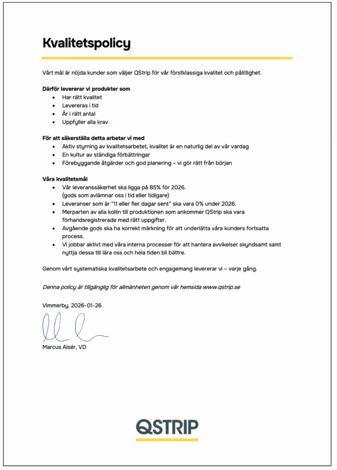 Vårt mål med kvalitetsarbetet är nöjda kunder och att leverera förstklassiga produkter och tjänster i rätt tid.